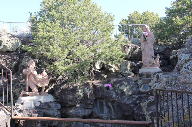 The shrine sits on a hill overlooking the town. The pathway leading up the hill to the church is lined with statues for each of the 15 stations of the cross.